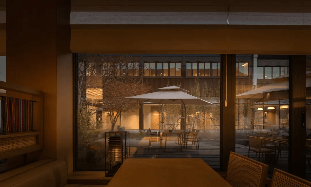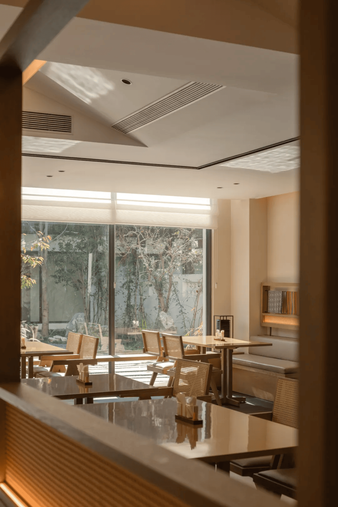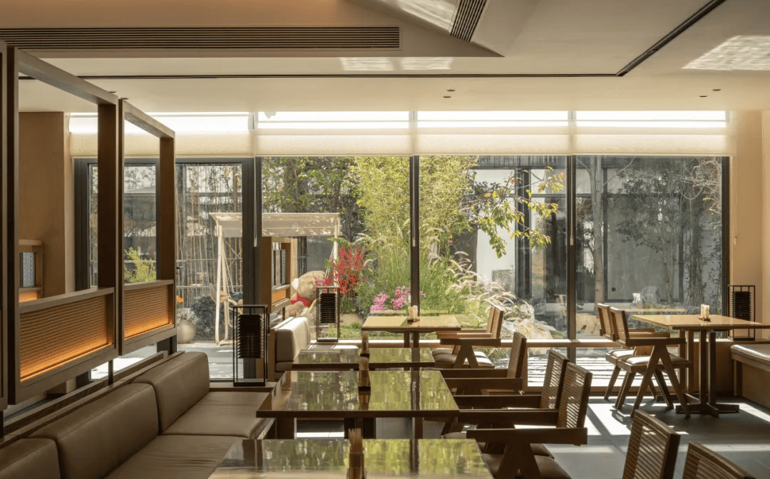 设计以当代造园手法勾勒烟火空间,兼顾精致与舒朗。连续开放的窗景,消解人与园的界限,让风味体验升级为精神层面的美学享受,持续强化微度假的治愈感。