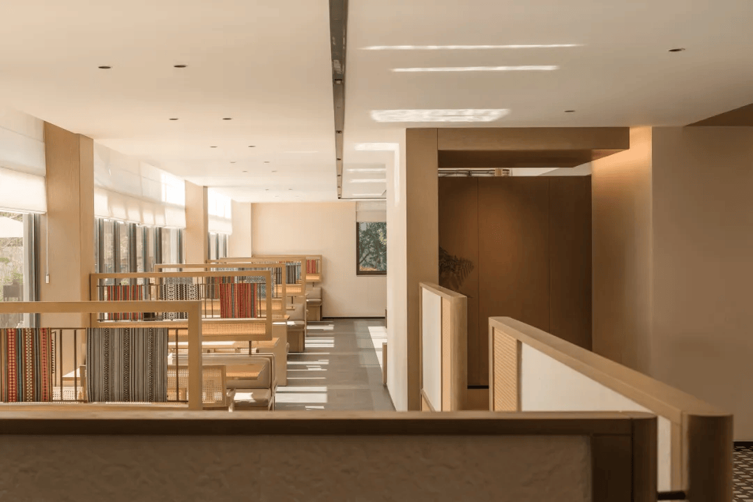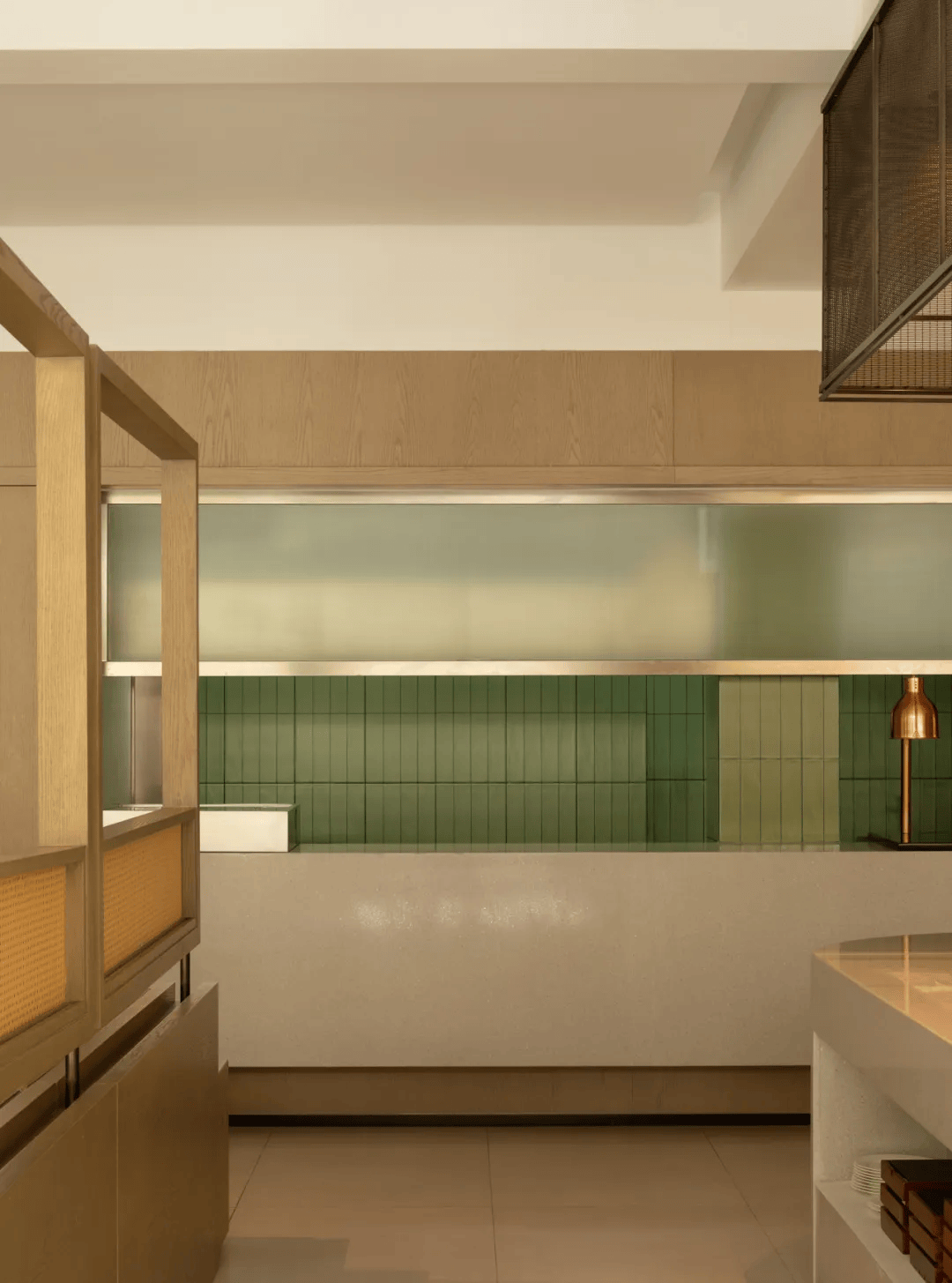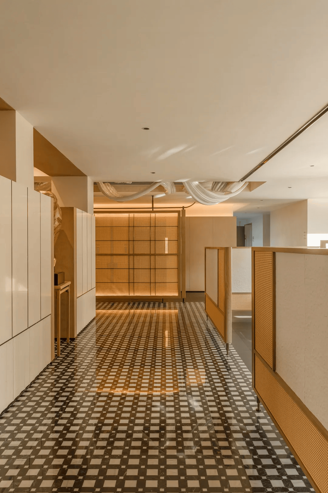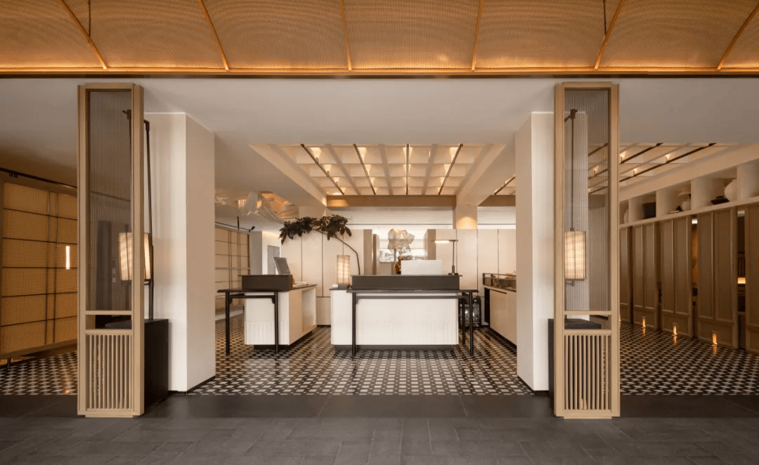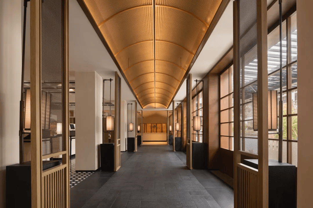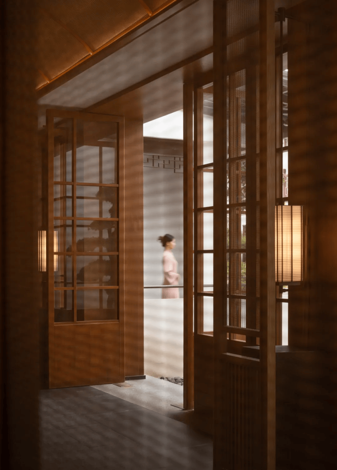 以苏式窗格、漏窗为设计元素,对称的秩序与细腻的格栅,铺就当代与古意的意味悠长。行走间,光影斑驳,消解内外、古今的界限,移步易境间,牵引心神沉浸于时光回响,加深沉浸氛围。