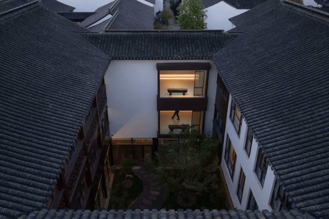 历史与现代的对话:酒店选址于苏州桃花坞,唐寅曾在此写下“桃花仙人种桃树,又摘桃花换酒钱”的逍遥诗篇。设计以“重温唐寅梦,再游桃花源”为脉络,通过“一园·一院·一居”的布局,将文脉转化为可栖居的当代空间,实现“身体安顿”与“精神回归”的双重疗愈。