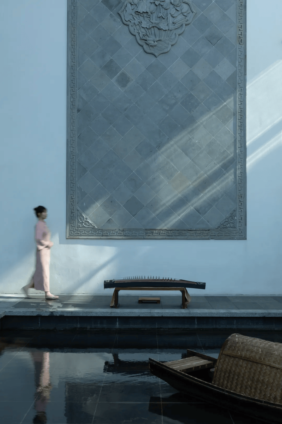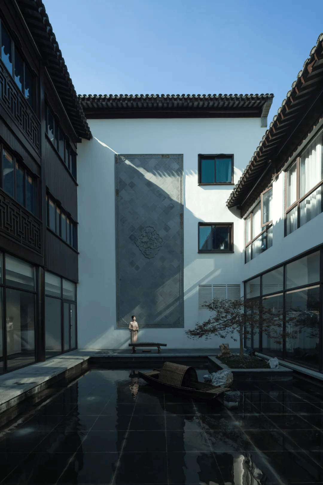 青砖照壁,疏影横斜,尽显江南风情。水光潋滟,乌篷静泊,置身其中,物我两忘,在纯粹氛围中实现身心放松,完成一场与古老园意的心灵对话。