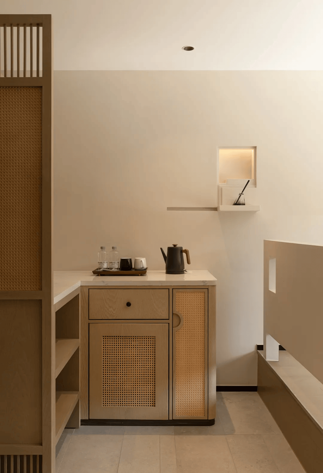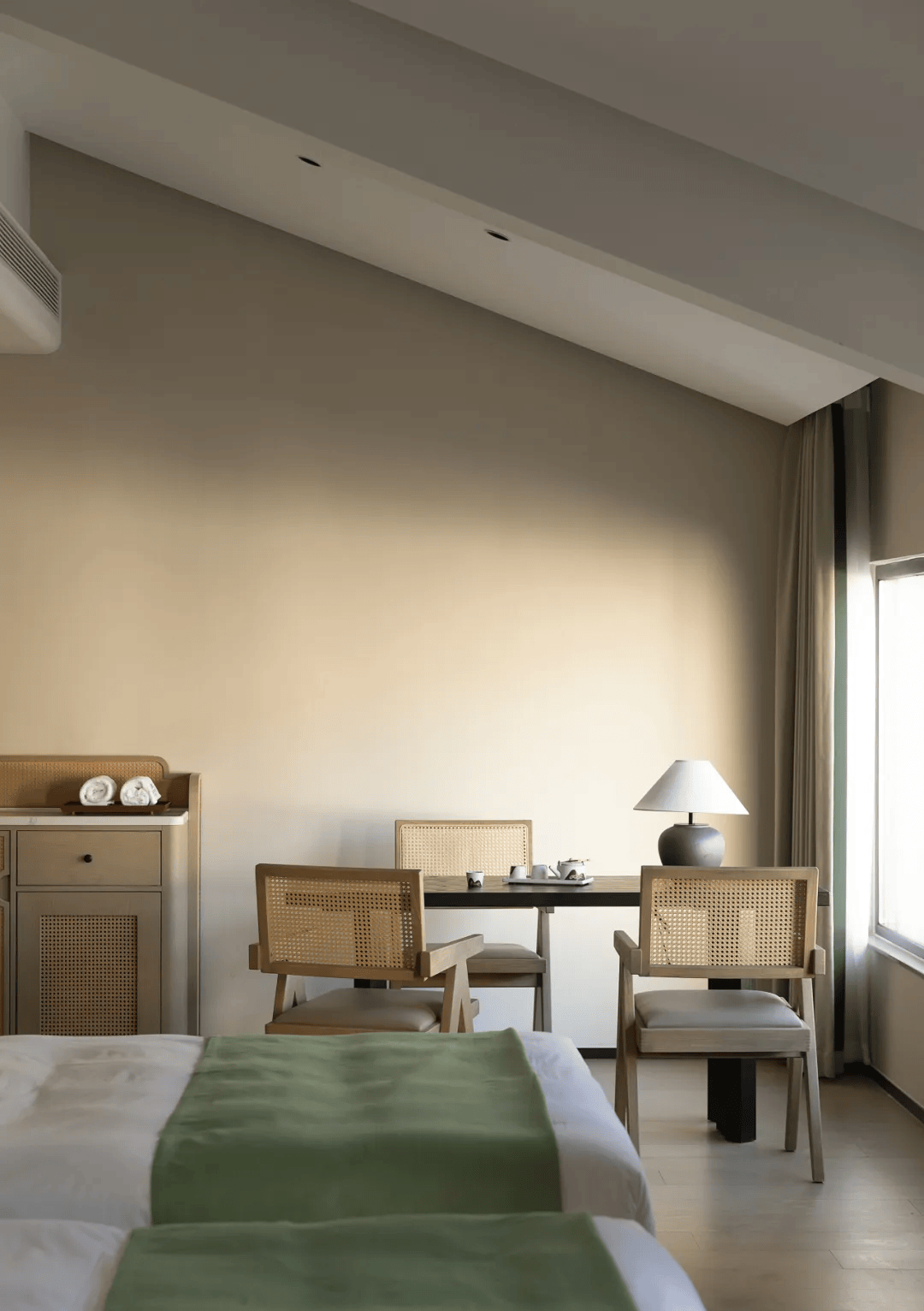 或以体块分区,或作百叶隔断,楼下茶叙畅谈,楼上静卧沐光,互不干扰,各有所趣。木构的温润、草木的清新色、格栅的通透意,搭配当代东方的宁谧雅意,皆融入栖居的叙事,共融舒适呼吸感的休憩氛围。